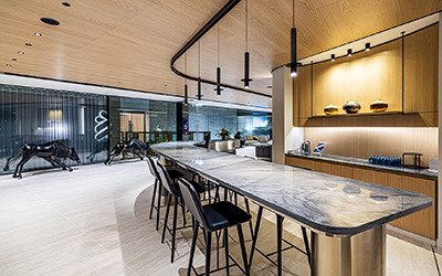 For the 200m2 ceiling at Standard Chartered designers worked with the installers and LSA to create a ceiling using standard size panels and standard details for optimum system efficiency and flexibility of installation on-site. By using a standard panel module, all panels are demountable and interchangeable making them perfect for spaces with servicing and access needs in the upper soffit. The capax ceiling system clips together to form a solid suspended mounting grid for panels with space to insert acoustic mineral wool. The T-shaped supporting grid profiles run along the length of each panel and fit perfectly into veneer wrapped grooves in the panel edges for seamless installation. The stability of the gypsum particleboard core removes the need for any expansion or movement gaps between panels meaning that all panel abutments can be completely flush and millimetre perfect without the risk of panels warping over time.